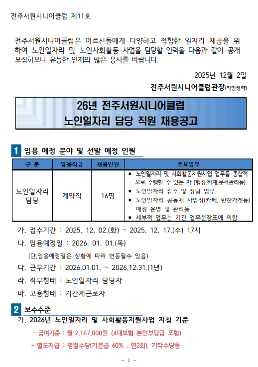 제11호 2026년 전주서원시니어클럽 노인일자리 담당자 채용 공고