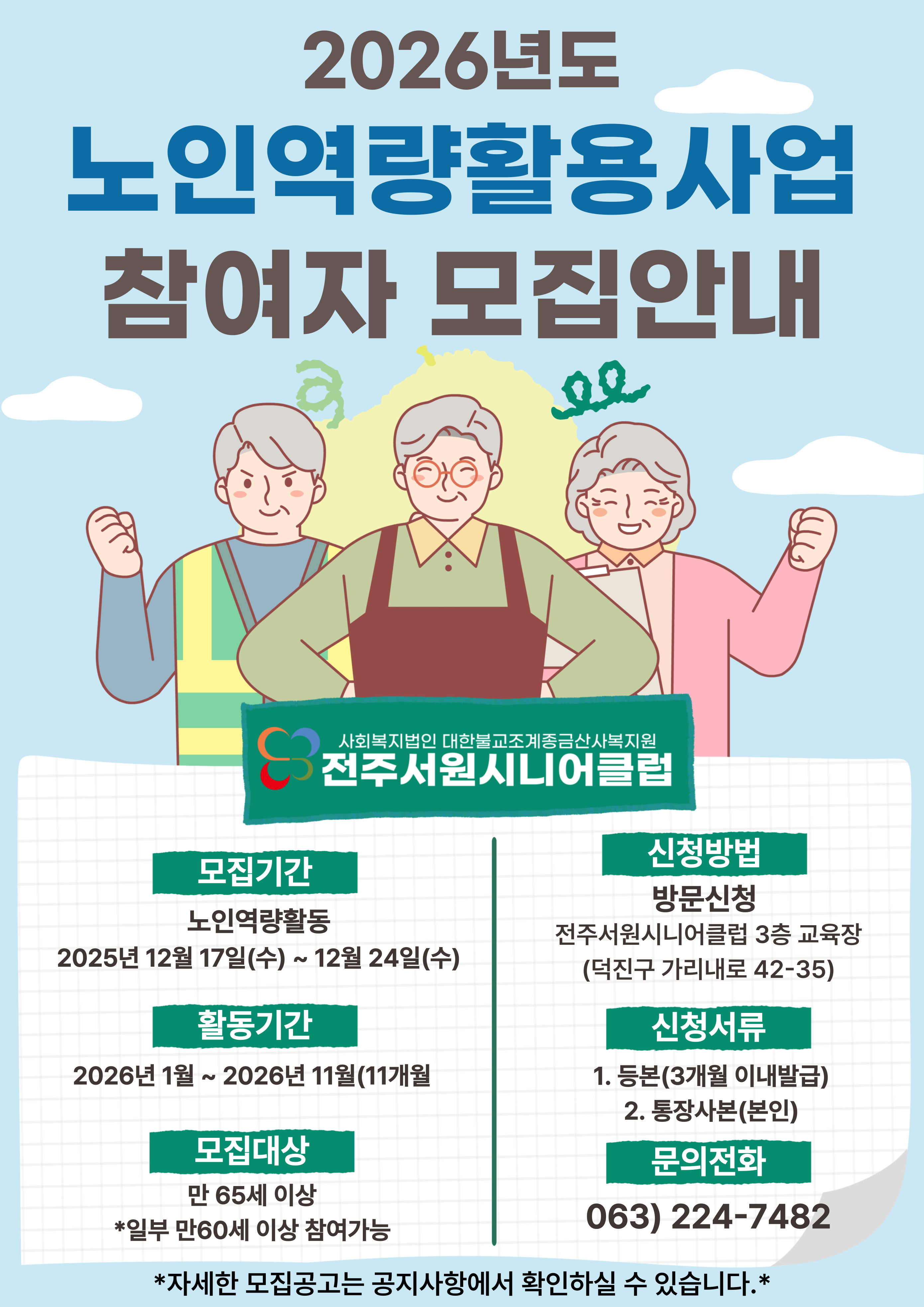 2026년 전주서원시니어클럽 노인역량활용사업 참여자 모집
