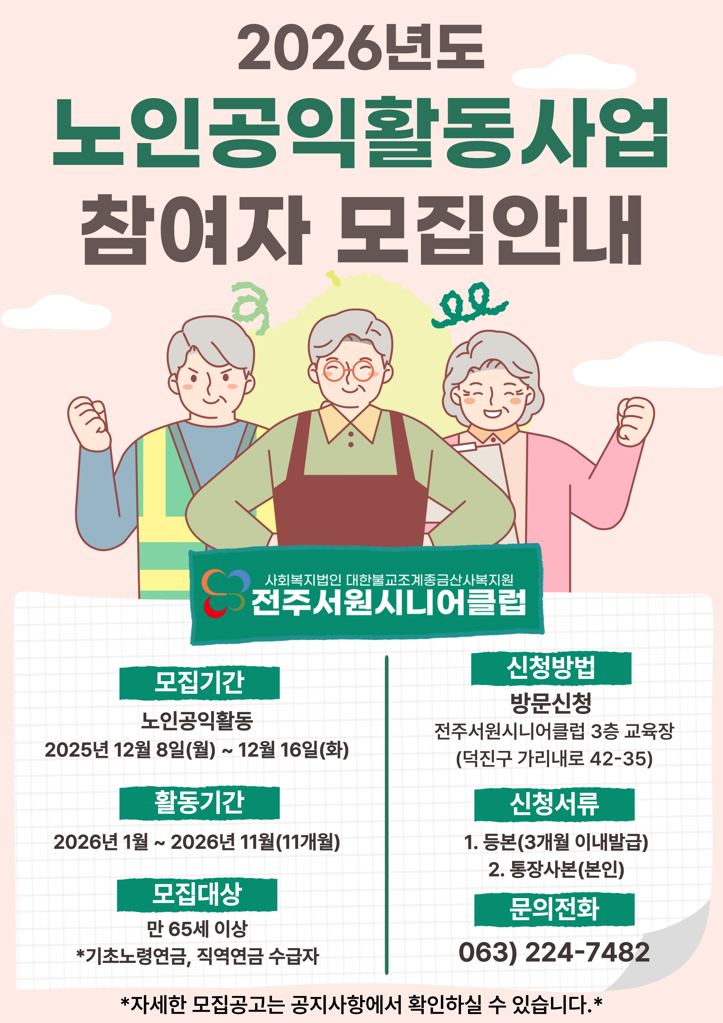 2026년 전주서원시니어클럽 노인공익활동사업 참여자 모집