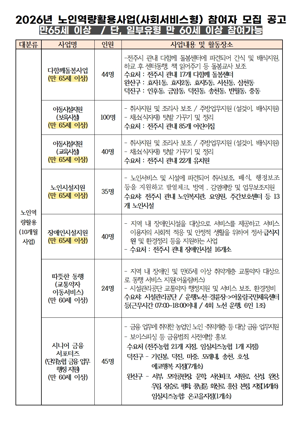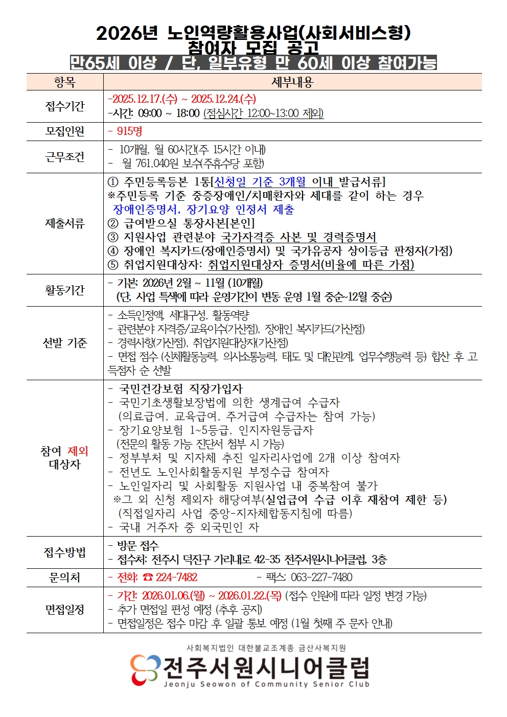 2026년 전주서원시니어클럽 노인공익활동사업 참여자 모집